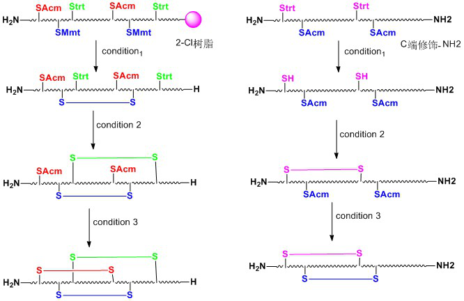 当需要形成2对或2对以上的二硫键时,合成过程则相对复杂。尽管二硫键的形成通常是在合成方案的最后阶段完成,但有时引入预先形成的二硫化物是有利于连合或延长肽链的。通常采用的巯基保护基有trt, Acm, Mmt, tBu, Bzl, Mob, Tmob等多种基团。我们分别列出两种以2-Cl树脂和Rink树脂为载体合成的多肽上多对二硫键形成路线: