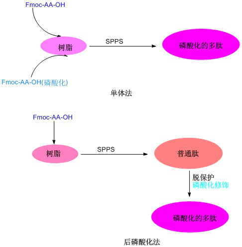 磷酸化多肽主要指肽链中的Ser、Tyr和Thr残基的侧链羟基被修饰成酸式磷酸酯多肽。目前为止,多肽的磷酸化修饰主要有后磷酸化法和单体法两种合成方法: