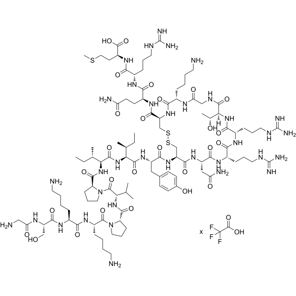 描述:Thanatin TFA 是一种诱导型阳离子抗菌肽。Thanatin TFA 是一种病原体诱导的含有单二硫键的 β-发夹 AMP。Thanatin TFA 对革兰氏阴性菌和革兰氏阳性菌以及各种真菌均表现出广谱活性,MIC 分别为 0.3-40 µM、0.6-40 µM 和 0.6-20 µM。Thanatin TFA 具有竞争性替换细菌外膜 (OM) 上的二价阳离子的特性,从而导致 OM 破坏。