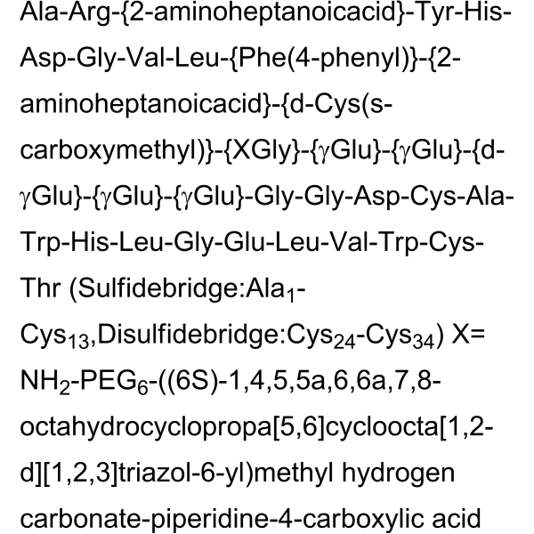 序列:AR-{2-aminoheptanoicacid}-YHDGVL-{Phe(4-phenyl)}-{2-aminoheptanoicacid}-{d-Cys(s-carboxymethyl)}-{XGly}-{γGlu}-{γGlu}-{d-γGlu}-{γGlu}-{γGlu}-GGDCAWHLGELVWCT (Sulfidebridge: Ala1-Cys13,Disulfidebridge:Cys24-Cys34) X= NH2-PEG6-((6S)-1,4,5,5a,6,6a,7,8-octahydrocyclopropa[5,6]cycloocta[1,2-d][1,2,3]triazol-6-yl)methyl hydrogen carbonate-piperidine-4-carboxylic acid
