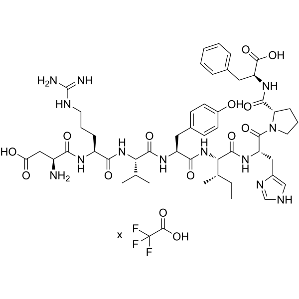 描述:Angiotensin II human (Angiotensin II) TFA 是一种血管收缩剂,是肾素/血管紧张素系统的主要生物活性肽。Angiotensin II human TFA 在调节人类血压中起着核心作用,主要通过血管紧张素 II 与 G 蛋白偶联受体 (GPCRs)、血管紧张素II 1型受体 (AT1R) 和血管紧张素II 2型受体 (AT2R) 之间的相互作用来介导。Angiotensin II human TFA 刺激交感神经刺激,增加醛固酮生物合成和肾脏活动。Angiotensin II human TFA 诱导血管平滑肌细胞生长,增加成纤维细胞中 I 型和 III 型胶原的合成,导致血管壁和心肌增厚,并导致纤维化。Angiotensin II human TFA 也诱导细胞凋亡。Angiotensin II human TFA 通过 LOX-1 依赖的氧化还原敏感途径诱导内皮细胞毛细血管形成。