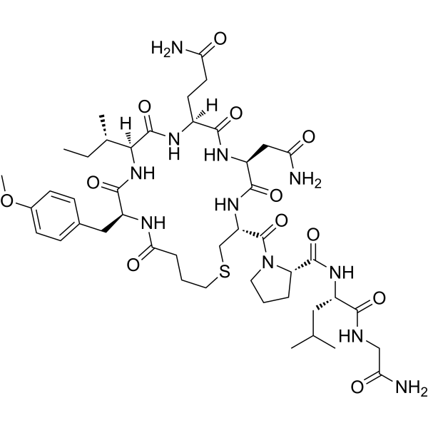 描述:Carbetocin 是一种催产素 (OT) 类似物,是催产素受体 (oxytocin receptor) 激动剂,Ki 是 7.1 nM。Carbetocin 对催产素受体的嵌合 N 末端 (E1) 具有高亲和力 (Ki=1.17 μM)。Carbetocin 具有用于产后出血研究的潜力。Carbetocin 能透过血脑屏障,可以通过激活 CNS 中的催产素受体而具有类抗抑郁活性。