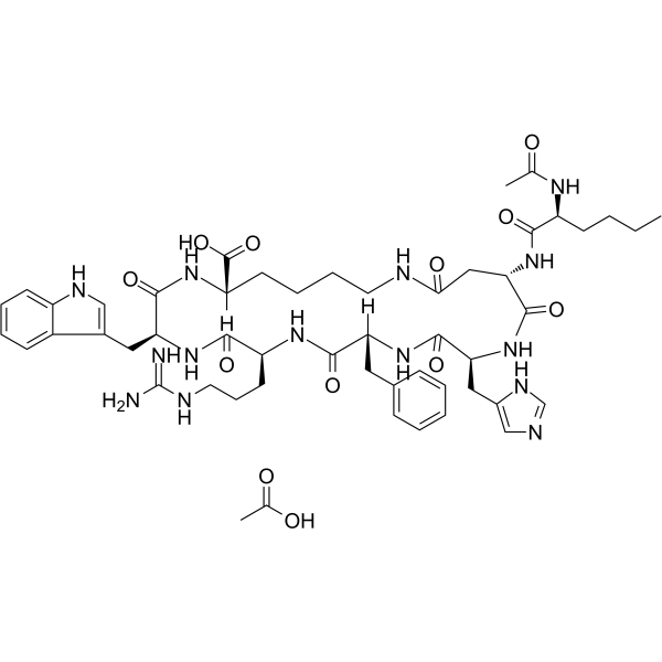 描述:Bremelanotide Acetate (PT-141 Acetate),α-MSH 的合成肽类似物,是黑素皮质素受体 (melanocortin receptors),包括 MC3R 和 MC4R 的激动剂,有潜力用于性功能障碍的研究。