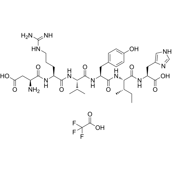 描述:Angiotensin I/II (1-6) TFA 含有 1-6 个氨基酸,由血管紧张素 I/II 肽转化而来。前体血管紧张素原被肾素裂解形成 Angiotensin I。Angiotensin I 被血管紧张素转换酶 (ACE)水解形成具有生物活性的 angiotensin II。Angiotensin II 用于高血压、肾素-血管紧张素系统和特发性膜性肾病的研究。