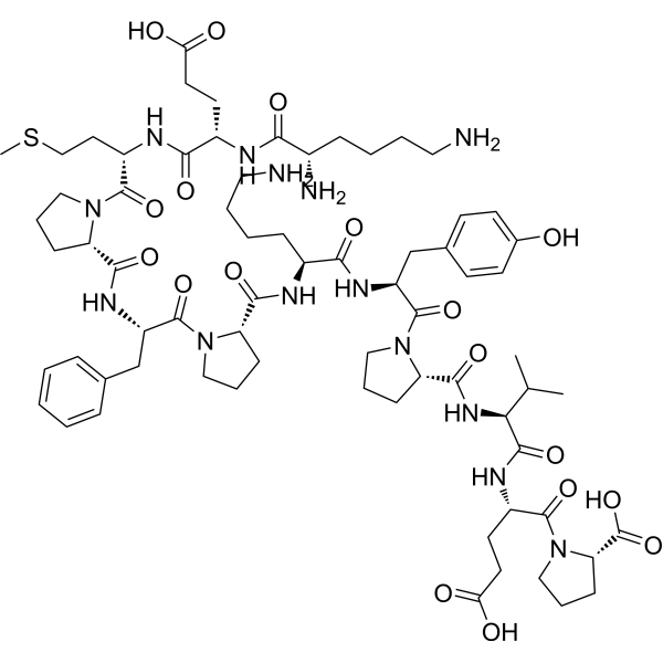描述:KEMPFPKYPVEP 是 12 个氨基酸组成的神经肽。KEMPFPKYPVEP 可以上调前额叶皮质中的多巴胺 (DA) 和去甲肾上腺素 (NE) 水平,在 Scopolamine (HY-N0296) 诱导的遗忘症小鼠模型中表现出促进空间和物体识别记忆的能力。