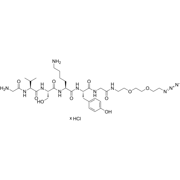 描述:GVSKYG-PEG2-azide (hydrochloride) 是一种点击化学试剂,它含有叠氮基团,可以与含有炔基团的分子发生铜催化的叠氮化物-炔环加成反应 (CuAAc) 。含有 DBCO 或 BCN 基团的分子也可能发生应变促进的炔烃叠氮化物环加成 (SPAAC)。