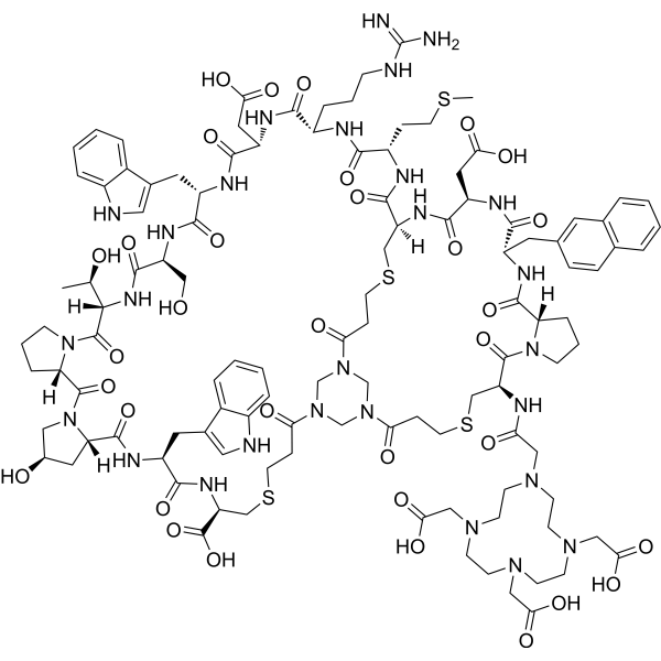 描述:N188 是一种基于双环肽骨架的放射性配体,用于靶向 nectin-4,这是一种在多种肿瘤中过表达的蛋白质。N188 能够被高效地放射性标记为 68Ga-N188,这是一种适合正电子发射断层扫描 (PET) 成像的放射性同位素。N188 及其放射性标记形式 68Ga-N188 的开发,可用于尿路上皮癌等肿瘤的诊断和治疗。