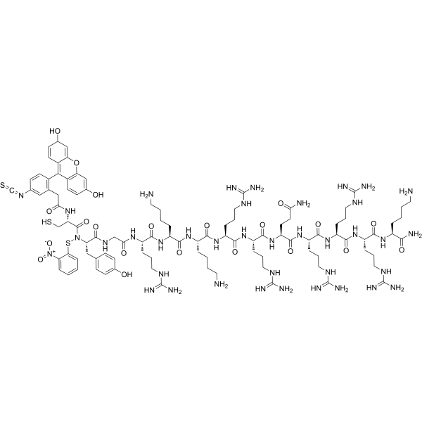 描述:Cys(Npys)-TAT (47-57), FAM-labeled 是一种 Cys(Npys) 激活的细胞渗透性多肽 (CPP),带有 FAM 标记。