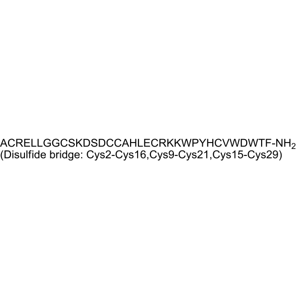 序列:ACRELLGGCSKDSDCCAHLECRKKWPYHCVWDWTF-NH2 (Disulfide bridge: Cys2-Cys16,Cys9-Cys21,Cys15-Cys29)