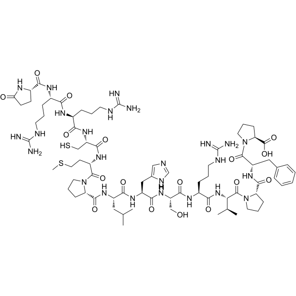 描述:Elabela(19-32) 是与 apelin 受体 (APJ) 结合的 ELABELA (ELA) 活性片段。Elabela(19-32) 激活 Gαi1 和 β-arrestin-2 信号通路,EC50 分别为 8.6 nM 和 166 nM。Elabela(19-32) 诱导受体内在化,降低动脉压,对心脏产生正性肌力作用。