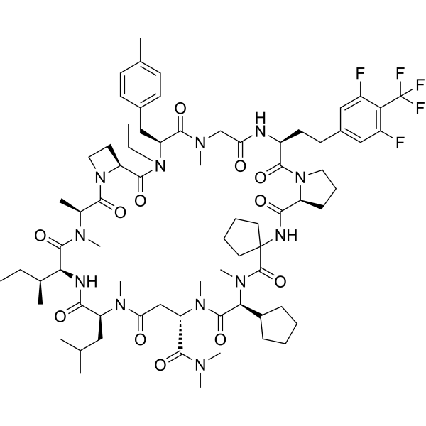 描述:LUNA18 是一种口服环状肽 KRAS 和 ERK 抑制剂。LUNA18 在 RAS 突变的癌细胞中磷酸化 ERK 和 AKT,降低细胞增殖。LUNA18 在小鼠异种移植模型中通过抑制 RAS 与鸟嘌呤核苷酸交换因子 (GEFs) 的相互作用,表现出持久的 RAS 信号抑制和有效的抗癌活性。LUNA18 对 KRAS 基因改变的细胞系,如结肠癌、胃癌、非小细胞肺癌和胰腺癌都有显著的细胞疗效。