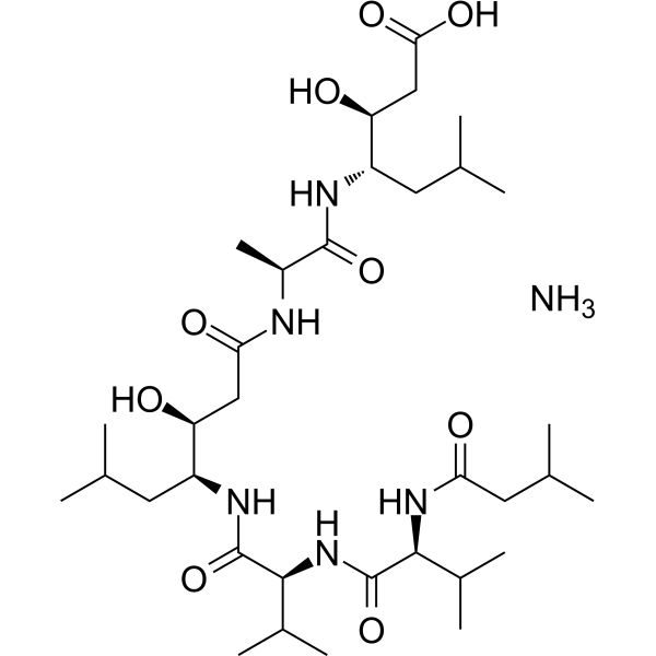 描述:Pepstatin (Pepstatin A) Ammonium 是由放线菌类产生的一种特异性的、具有口服活性的天冬氨酸蛋白酶 (aspartic proteases) 抑制剂,能够抑制 hemoglobin-pepsin、hemoglobin-proctase、casein-pepsin、casein-proctase、casein-acid protease 和 hemoglobin-acid protease 的活性,IC50 值分别为 4.5 nM、6.2 nM、150 nM、290 nM、520 nM 和 260 nM;同时可抑制 HIV protease 的活性。