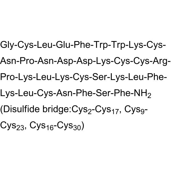 序列:GCLEFWWKCNPNDDKCCRPKLKCSKLFKLCNFSF-NH2 (Disulfide bridge:Cys2-Cys17, Cys9-Cys23, Cys16-Cys30)