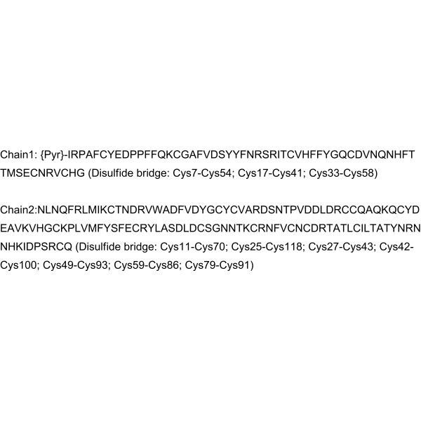 序列:Chain1: {Pyr}-IRPAFCYEDPPFFQKCGAFVDSYYFNRSRITCVHFFYGQCDVNQNHFTTMSECNRVCHG (Disulfide bridge: Cys7-Cys54; Cys17-Cys41; Cys33-Cys58); Chain2: NLNQFRLMIKCTNDRVWADFVDYGCYCVARDSNTPVDDLDRCCQAQKQCYDEAVKVHGCKPLVMFYSFECRYLASDLDCSGNNTKCRNFVCNCDRTATLCILTATYNRNNHKIDPSRCQ (Disulfide bridge: Cys11-Cys70; Cys25-Cys118; Cys27-Cys43; Cys42-Cys100; Cys49-Cys93; Cys59-Cys86; Cys79-Cys91)