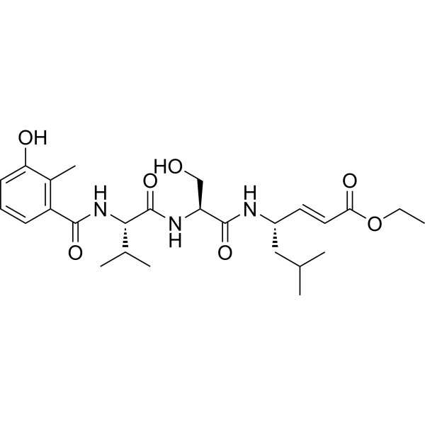 描述:HMB-Val-Ser-Leu-VE 是一种 prototype vinyl ester 乙烯酯抑制剂。HMB-Val-Ser-Leu-VE 具有抑制胰蛋白酶样 (T-L) 蛋白酶体活性的IC50为 0.033 μM。