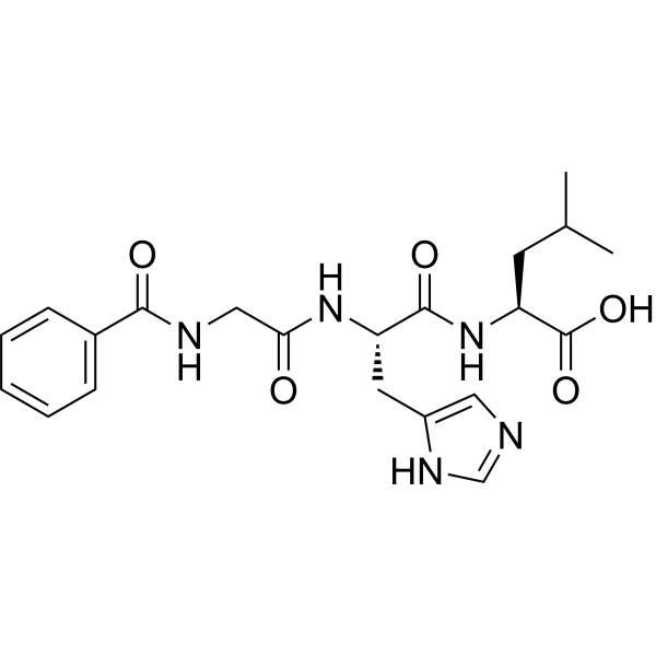 描述:Hippuryl-His-Leu-OH 是一种血管紧张素 I 转换酶的活性检测底物。Hippuryl-His-Leu-OH 释放的 His-Leu 能与邻苯二甲醛或荧光胺 (Fluorescamine,HY-D0715) 反应,用于荧光检测。