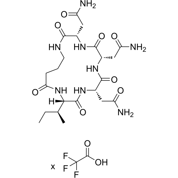 描述:SPSB2-iNOS inhibitory cyclic peptide-3 (Compound CP3) 通过结合 SPRY 结构域与 SOCS-box 蛋白 2 (SPSB2) 上的 iNOS 位点 (KD 为 7 nM),抑制 SPSB2 和 iNOS 的相互作用。
