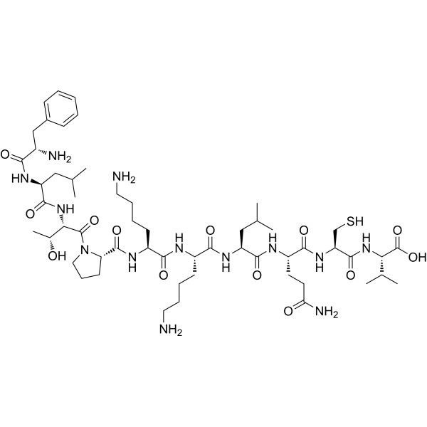 描述:CLIP(86-100)TFA是Ⅱ类相关不变链肽(CLIP)的86-100个氨基酸片段。CLIP是一个小的自体肽,也是位于HLA-II抗原结合区的固定链的裂解产物。通过与Ⅱ类肽结合位点的相互作用,CLIP在MHCⅡ类alphabetaIi复合体的组装和转运中起着关键作用。