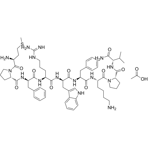 描述:Nonapeptide-1 (Melanostatine-5) acetate salt,一种多肽类激素,是 MC1R 选择性拮抗剂 (Ki: 40 nM)。 Nonapeptide-1 acetate salt 是一种竞争性的 α-MSH 拮抗剂,可有效抑制黑素细胞中 α-MSH 诱导的细胞内 cAMP 和黑素体扩散 (IC50 分别为 2.5 nM 和 11 nM)。 Nonapeptide-1 acetate salt 抑制黑色素合成,可用于研究皮肤色素沉着和肾上腺类固醇生成的调节、皮肤癌。