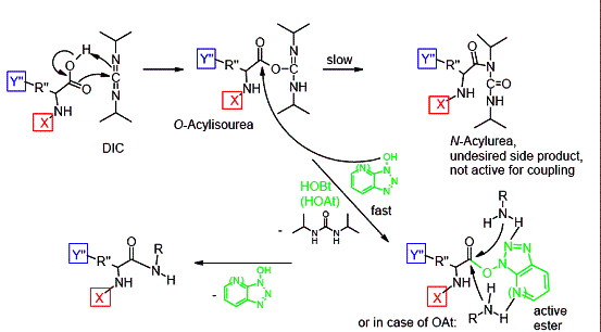 主要包括:DCC,DIC,EDC.HCl等。采用DCC进行反应,由于反应中生成的DCU,在DMF中溶解度很小,产生白色沉淀,所以一般不用在固相合成中,但是由于其价格便宜,在液相合成中,可以通过过滤除去,应用仍然相当广泛。EDC.HCl因为其水溶解性的特点,在多肽与蛋白的连接中使用比较多,而且也相当成功。但是该类型的缩合试剂的一个最大的缺点,就是如果单独使用,会有比较多的副反应,但是研究表明如果在活化过程中添加HOBt,HOAt等试剂,可以将其副反应控制在很低的范围。其反应机理如下: