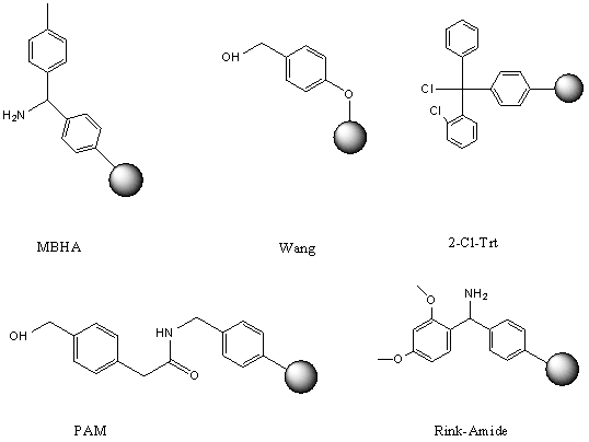 固相多肽合成中树脂,一般都是聚苯乙烯-二乙烯苯材料,大小在75-150μm,交联度在1-2%之间,现在使用的大多是1%,因为这种交联度下,树脂在DMF,DCM中具有很好的溶胀性能,立体上是一个空间网状结构,反应物分子可以在树脂内部自由移动。树脂中最关键的部分是连接手臂,它一端连接在树脂上,一端作为反应位点。目前广泛使用的树脂有:PAM,MBHA,Wang,2-Cl-Trt,Rink-Amide-MBHA等。其中PAM,MBHA是用在BOC策略中,因为其对酸非常稳定,需要在HF,TFMSA等强酸条件下才能够切割下来。